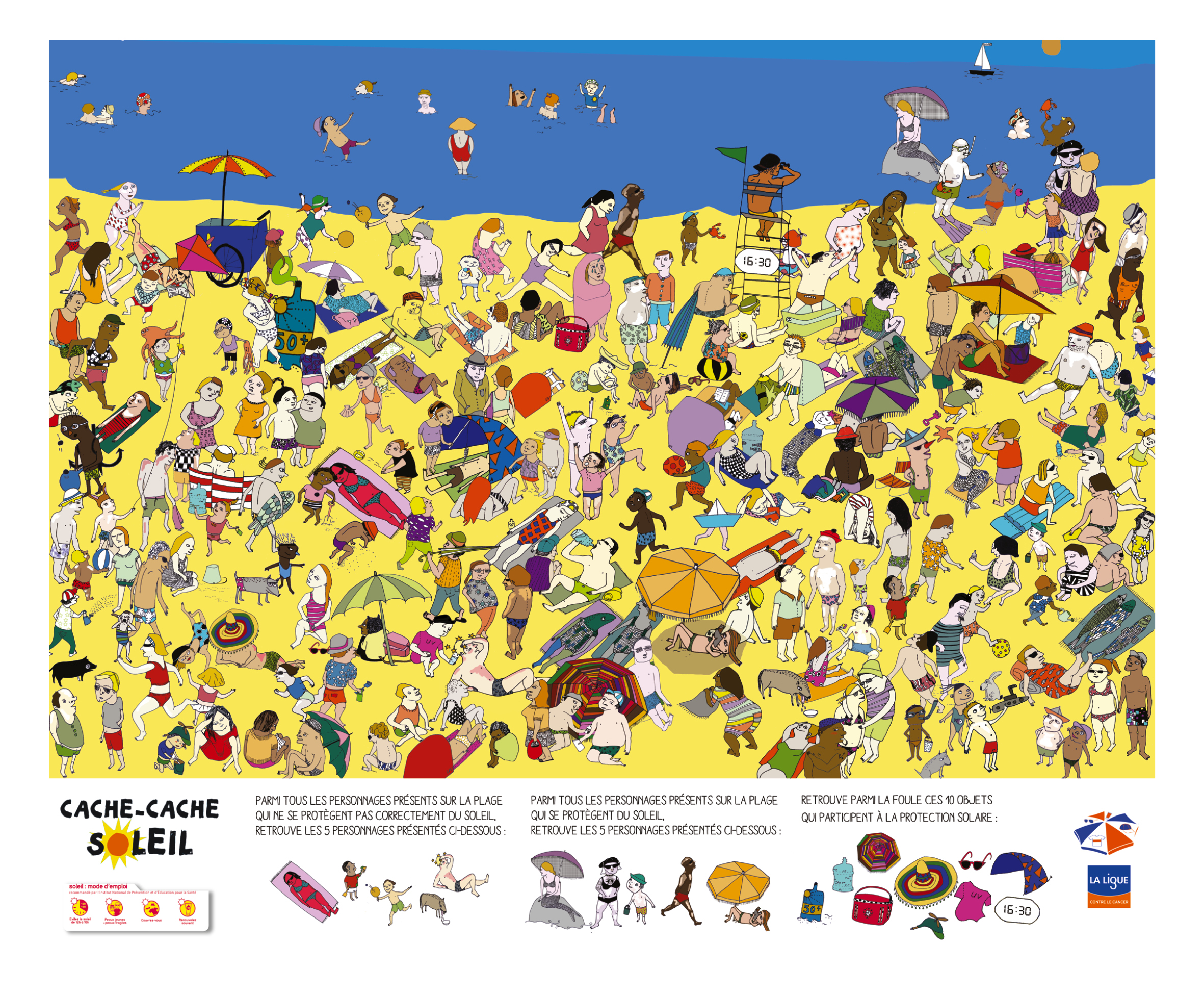 Au bord de la mer, on aime tous ou presque profiter du soleil, c’est naturel. Mais il faut savoir s’en protéger. Découvre les bons gestes, et repère sur cette illustration les imprudents qui se mettent en danger.
