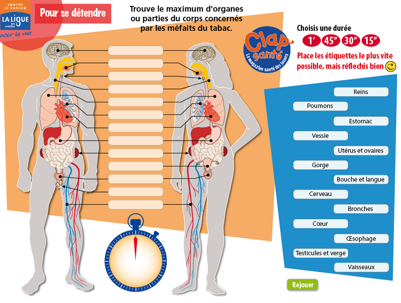 Le tabac n'a pas seulement des effets néfastes sur les poumons, loin de là ! Sauras-tu retrouver les autres parties du corps ou organes touchés par la cigarette ?