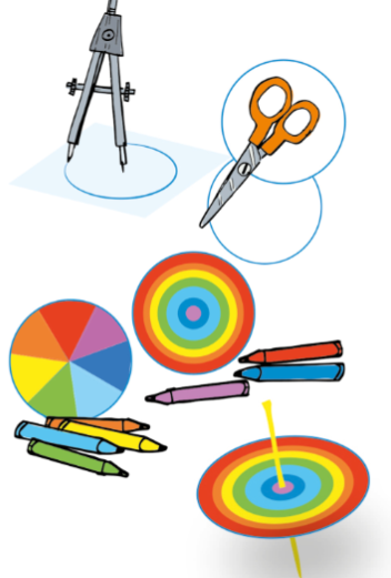 Sur le premier disque blanc, colorie de grands triangles aux couleurs de l'arc-en-ciel : orange, rouge, violet, bleu foncé, bleu clair, vert et jaune. Sur le second, dessine des spirale avec les mêmes couleurs. Il ne doit plus y avoir de blanc.