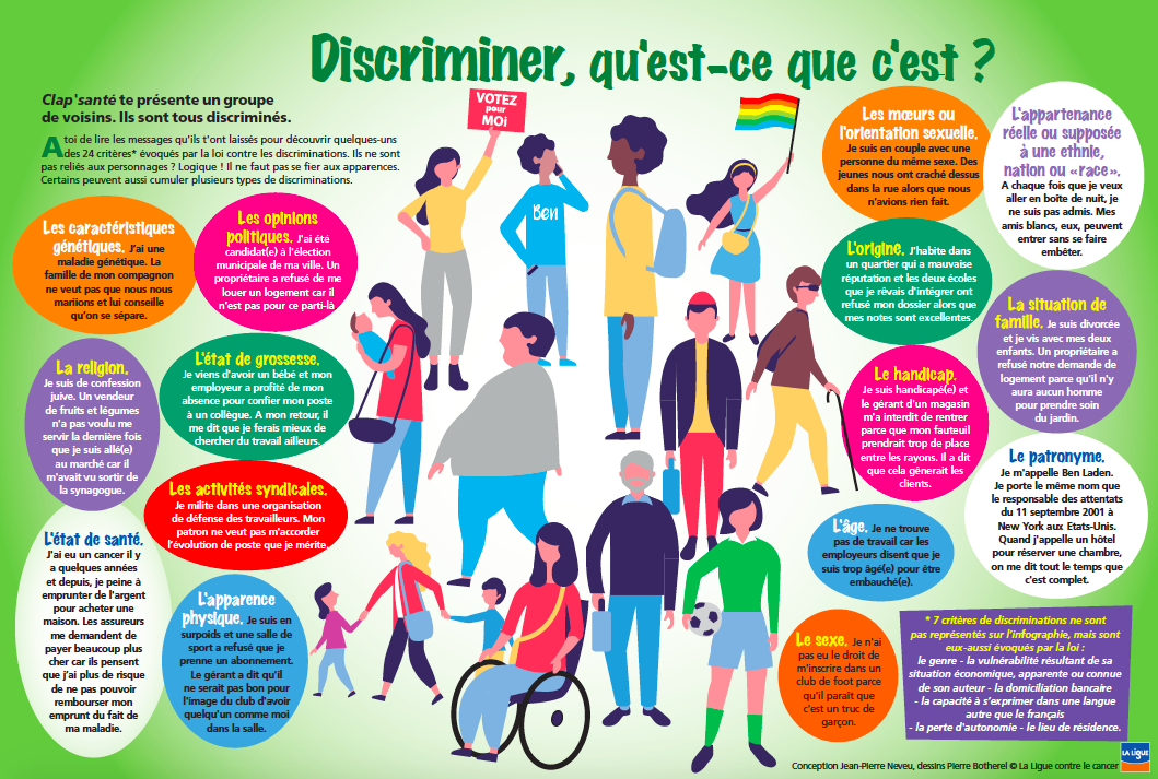 Lis les messages à travers l'infographie pour découvrir quelques-uns des 24 critères évoqués par la loi contre les discriminations. Ils ne sont pas reliés aux personnages ? Logique ! Il ne faut pas se fier aux apparences. Certains peuvent aussi cumuler plusieurs types de discriminations.