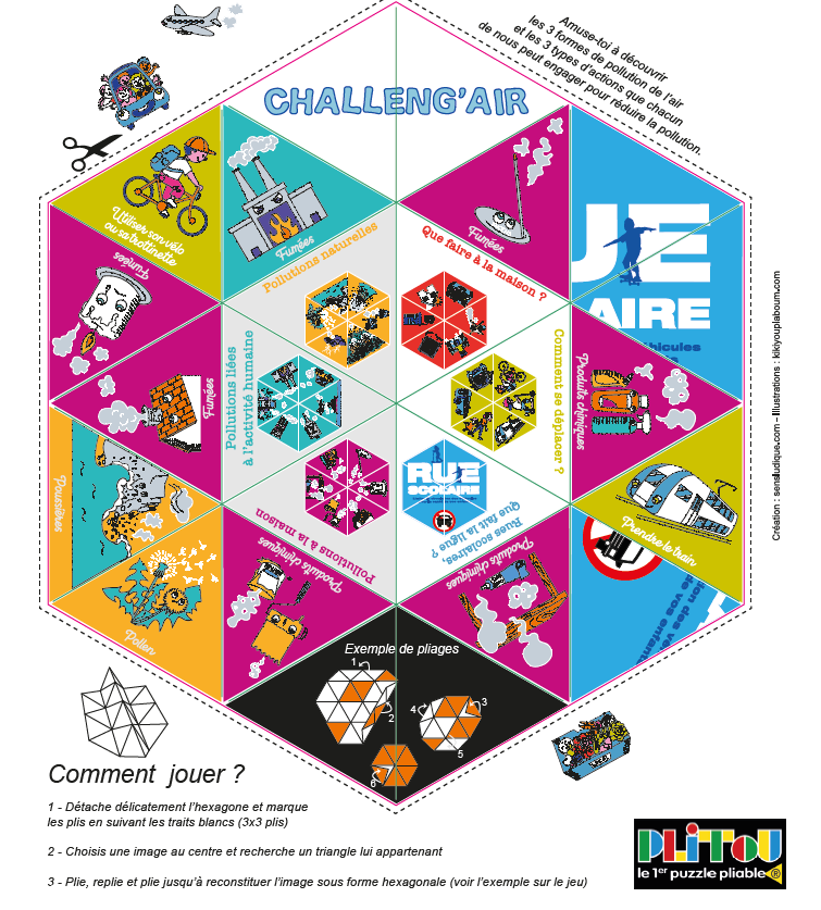 Voici un jeu à partager avec tes camarades et avec ta famille. Il a été conçu par la Ligue contre le Cancer pour te permettre d'acquérir des connaissances tout en t'amusant sur la pollution de l'air. Il t'aidera à comprendre quelles sont les différentes sources de la pollution de l'air et à réfléchir aux moyens d'action pour améliorer la qualité de l'air et créer un environnement favorable à la santé.